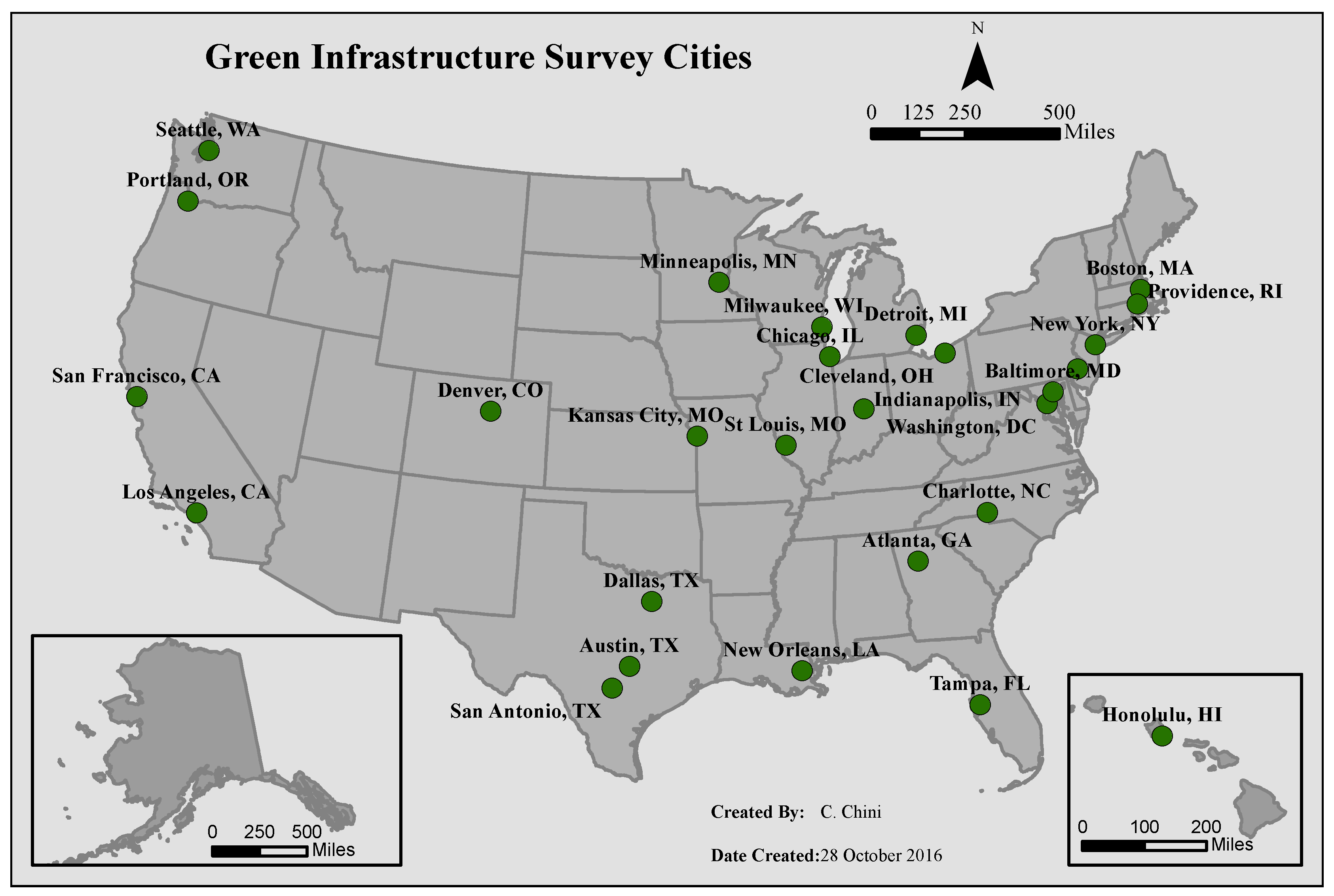 We utilize this method of data collection from websites in lieu of submitting formal questionnaires to evaluate the public accessibility of green infrastructure information. While this approach relies on publicly available and published resources, it creates a standard platform for comparing results. We recognize the limitations of this methodology and the benefits of formal questionnaires or surveys; however, the sociotechnical nature of green infrastructure requires stakeholder involvement and communication of the plan to the public. Therefore, if any green infrastructure plans are not readily available to the public, we conclude that no plan is currently implemented in that city. The answers to the above questions provided several important insights to the current status of green infrastructure as an urban experiment.