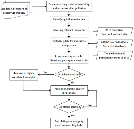 In recent years, a high number of environmental pollution disasters, such as air pollution, have emerged across vast parts of China [1,2,3]. Air pollution concentration in many regions of China has far exceeded the WHO’s air quality guidelines [4,5,6], and twenty Chinese cities were listed among the world’s thirty most polluted cities [7]. Cities in the Yangtze River Delta, Pearl River Delta, and Beijing–Tianjin–Hebei regions suffer from the worst air pollution, with PM2.5 concentration two to four times above the standards of the WHO guidelines [3]. In these regions, the average number of haze days has reached more than 100 days, and it even surpassed 200 days in several cities [8]. In January 2013, a thick haze had shrouded China’s central and eastern provinces that covered a quarter of the whole country and affected a population of about 600 million [8]. In December 2015, Beijing issued its “red alert” for the first time, the highest level for heavy air pollution, and some particulate indices soared dozens of times above the daily maximum level recommended by the World Health Organization [9]. Air pollution poses a significant threat to human health, justice issues, and even cultural heritage [10,11,12,13,14,15]. In China, the mortality rate from respiratory diseases is greater than 17% and has become the third largest killer only after circulatory disease and cancer [7]. There is no doubt that air pollution disasters have become the most pressing challenge for development in China and urgent action should be taken for creating a sustainable future. Actually, a disaster is a result of an unsustainable development combined with an ambiguous cultural reaction to balance the natural, economic, and social setting [16]. Therefore, besides energy and industrial structure adjustments, vulnerability assessment is another effective solution to withstand adverse effects of a hostile environment [17], especially, the identification of social vulnerability to air pollution can provide a scientific support for a reasonable resource allocation and efficient risk management. It is valuable and crucial to understand the nature of social vulnerability and develop a proper method to measure social vulnerability in the environment context.