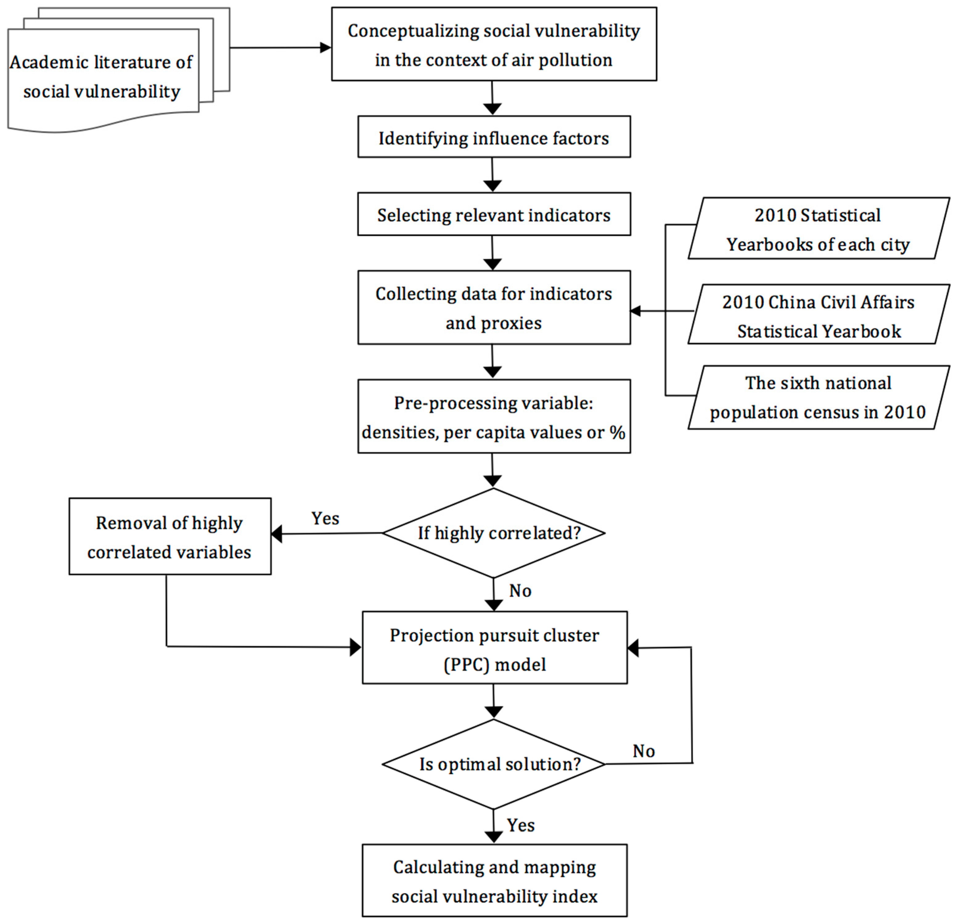 The remainder of this paper is organized as follows: In Section 2, after conceptualizing social vulnerability in the context of air pollution, a method for assessing social vulnerability with projection pursuit cluster (PPC) model is proposed with a case study of the Yangtze River Delta Region in China. In Section 3, based on the results from PPC model, spatial variations of social vulnerability index (SVI) and SVI dimensions (susceptibility, exposure, and adaptability) are mapped and analyzed. Finally, the paper closed with conclusions and recommendations in Section 4.