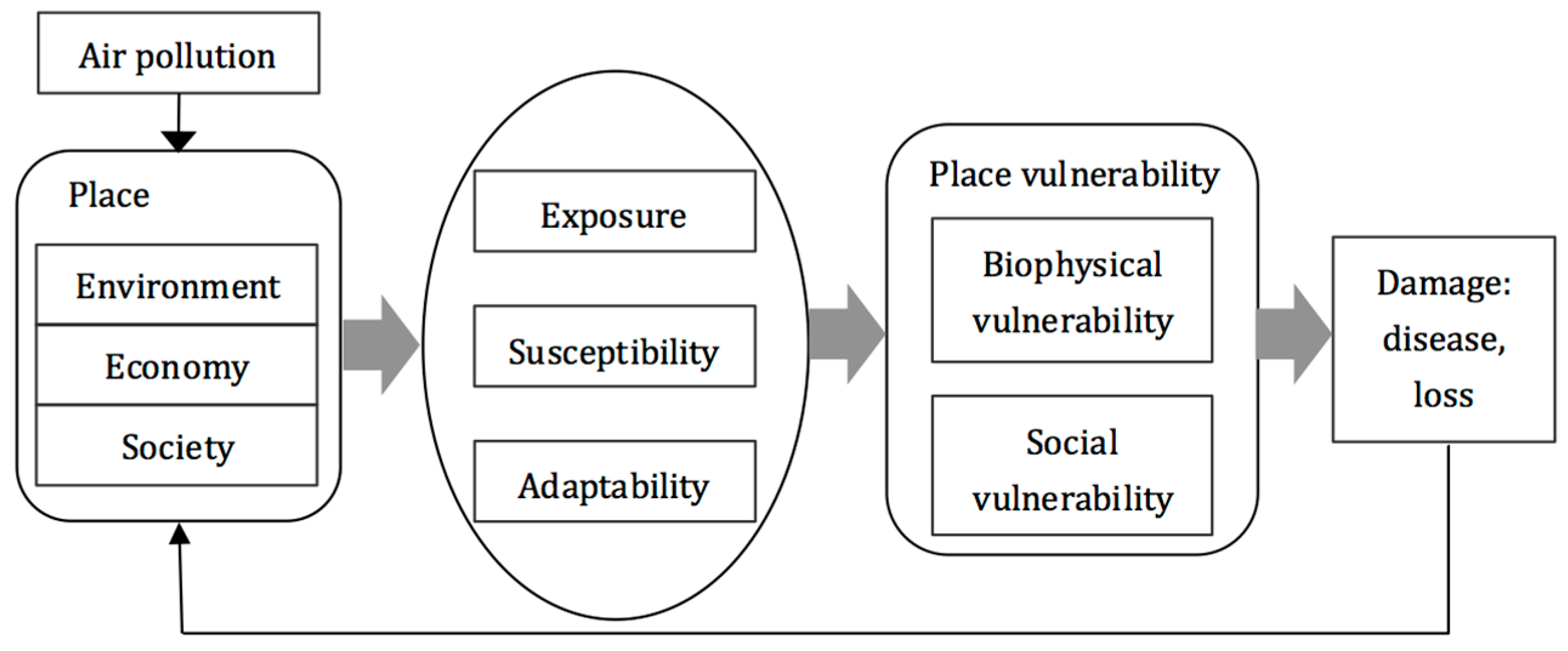 First of all, we conceptualized social vulnerability in the context of air pollution, referring to relevant studies of natural hazards (Figure 2). As we know, most attributes of a subject (e.g., people or region) fall into one of the three categories: environment, economy, and society. When subjects suffered from air pollution, these attributes would manifest in three forms of vulnerability: exposure, susceptibility, and adaptability. In the risk perspective, these three dimensions can be divided into biophysical and social vulnerabilities which interact with each other and produce the overall place vulnerability [29]. Place vulnerability interacts with air pollution to produce damage, such as disease and economic losses. Damage, in turn, can affect attributes of subjects and, furthermore, moderate or enhance vulnerability to air pollution. In this article, we only focus on the social vulnerability portion.