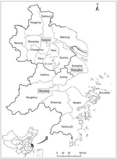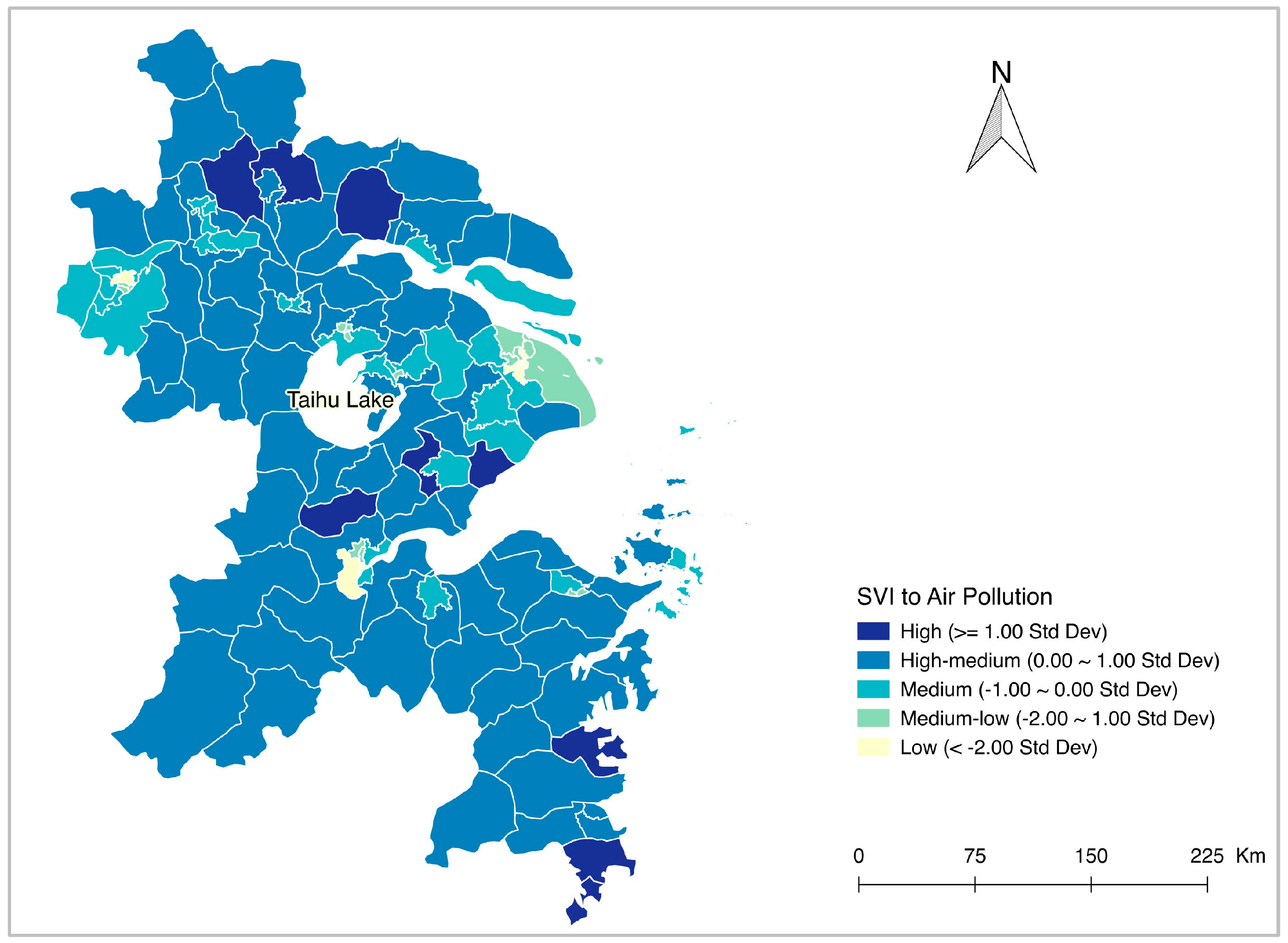 The Yangtze River Delta (YRD) region covers an area of 180,935 km2 and had a population of 81 million in 2010. Accounting for 1% of China’s land area and 7.6% of its population, this region creates 17.6% of the country’s GDP, produces 37.6% of its exports (by value), and attracts 41.8% of transnational investment in 2010. In terms of economy, technology, and culture, the delta region is one of the most developed and wealthiest in China. However, with rapid economic development and high-energy consumption, YRD has been suffering air pollution problems in the past three decades [67]. Air pollutant emissions are increasing steadily, regional visibility is decreasing, and ozone concentrations are increasing [68], all of which deteriorate the regional environment and pose high potential health risks to local residents. Hence, YRD is selected for assessing social vulnerability to air pollution in China.