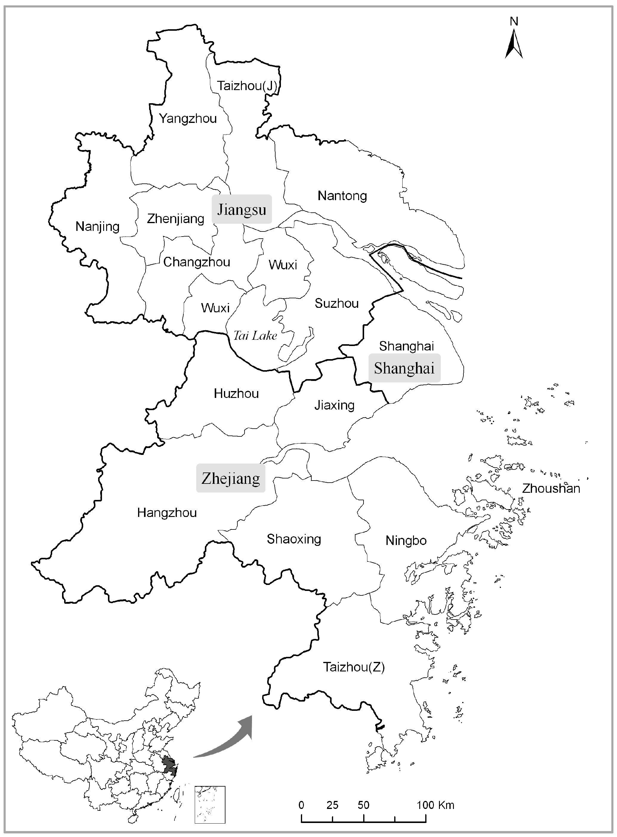 The Yangtze River Delta, China: location and cities.