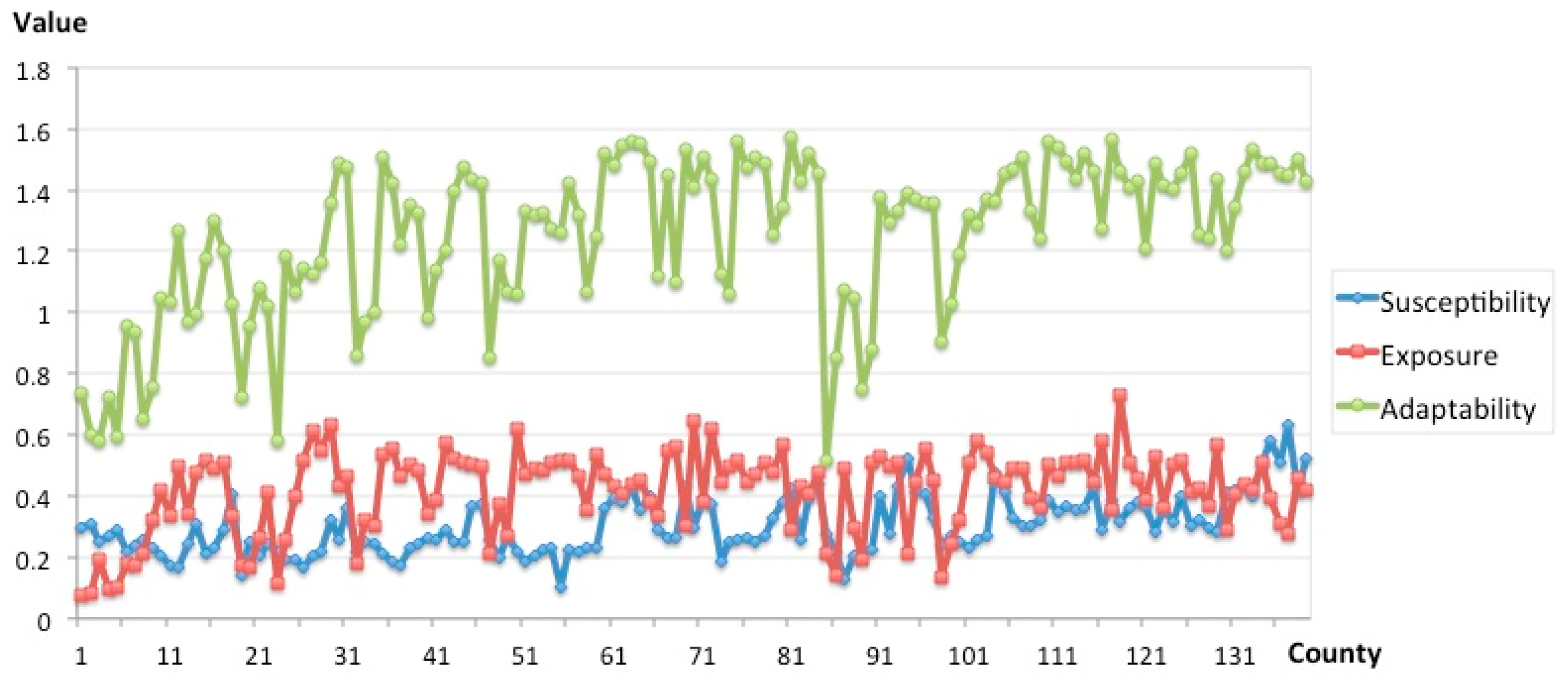 Spatial pattern of SVI dimension: susceptibility, exposure, and adaptability.