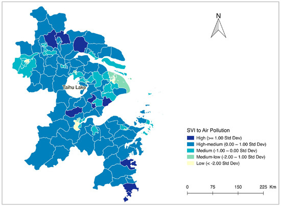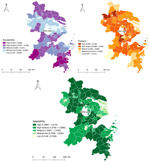With the weight of each indicator, we evaluated the values of SVI dimensions (susceptibility, exposure, and adaptability) in the YRD region (Figure 4). For 139 counties, the adaptability values are all higher than susceptibility and exposure values. Hence, improving adaptability of the YRD region will be an effective measure for reducing social vulnerability to air pollution. Spatial patterns of susceptibility, exposure, and adaptability are mapped as shown in Figure 5.