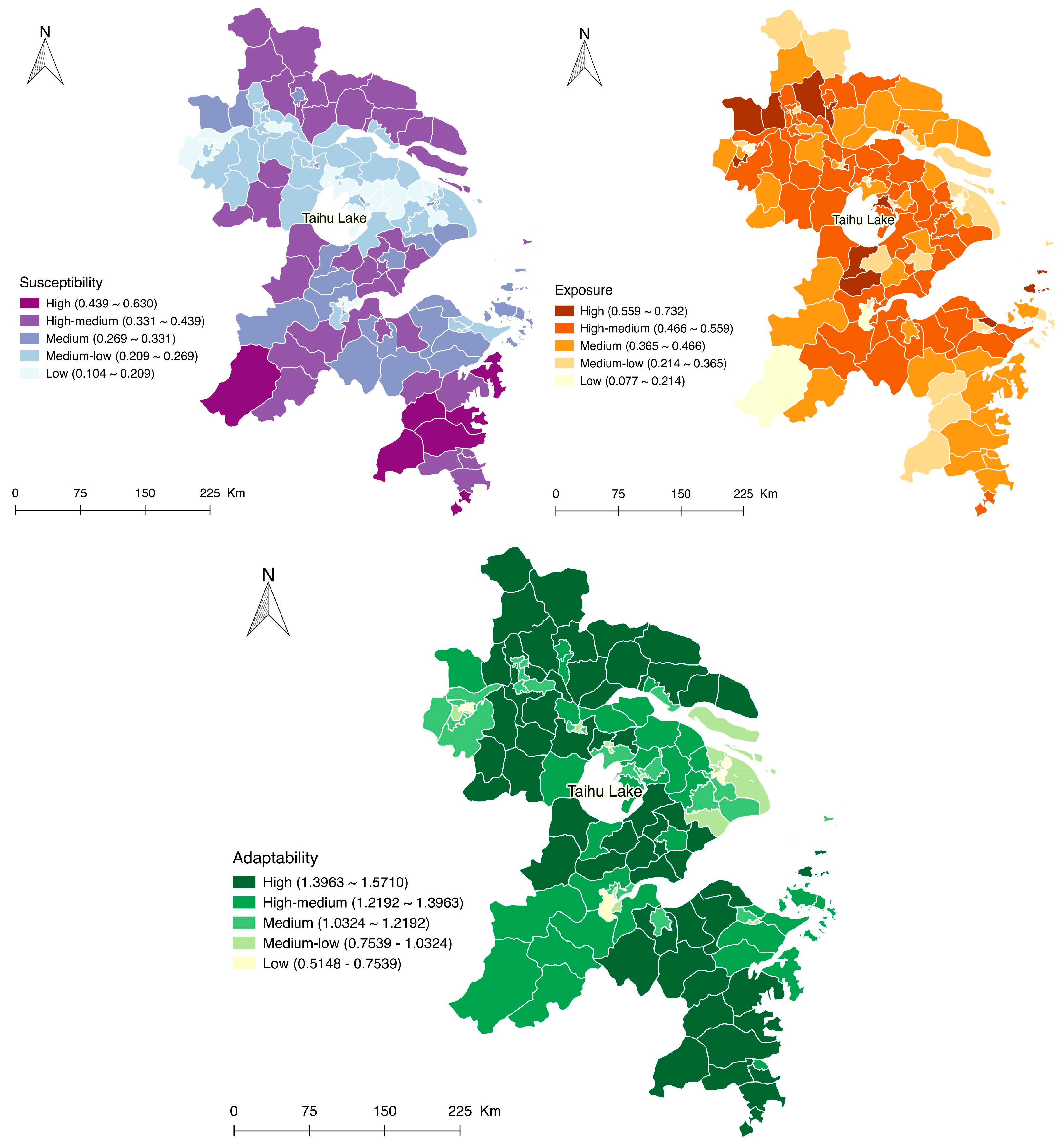 These maps address significant spatial clustering and variability in each SVI dimension (Figure 5). With regard to the YRD region, counties in the southern and northern ends tend to be highly susceptible, have medium exposure, but are highly adaptable, coinciding with a lower level of local economic development, but a relatively adequate resource supply for their city size. Counties around the periphery of Taihu Lake are less susceptible, more adaptable, but face greater exposure, since this area has the advantage in economic development and social services, while population exposure and urban sprawl are among the most significant and widespread in the nation. As for counties in the metropolitan area of Shanghai, they are less susceptible, with less or medium exposure, but show less or medium adaptability. This suggests that local infrastructure and social services cannot keep pace with the rapid urban expansion, as even considerable development has been witnessed in Shanghai.