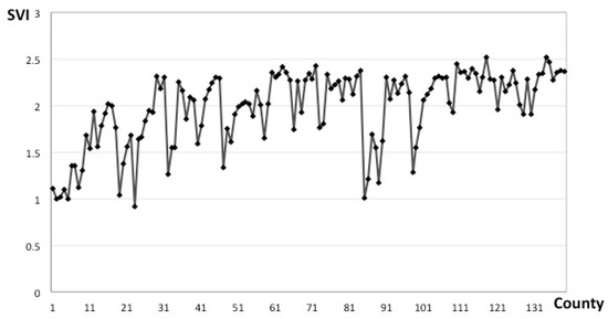 When has been calculated, the aggregated value () taken as the social vulnerability index can be obtained according to Equation (3). Thus, nineteen indicators for assessing social vulnerability are compressed into one dimension without any loss of potentially useful information.