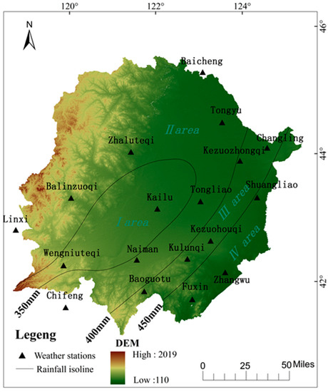 Horqin region is located in the west of Northeast China, including 22 Banners (counties, districts and cities). It includes the Inner Mongolia Autonomous Region, Liaoning Province and Jilin Province. Its overall area is 16.11 × 104 km2. Regarding the climatic belt division, it is a semi-humid and semi-arid transitional zone. Regarding the mode of production, it is the typical agro-pastoral transition zone. Regarding the landform type, it is a region transiting from the Inner Mongolia Plateau and Great Khingan to the Northeast China Plain. In this region, there are 14 Chinese meteorological stations (meteorological data sharing points). With the aim of improving the isoline accuracy of precipitation, four non-meteorological data sharing points are added (Figure 1). With the overall view of 18 meteorological stations between 1961 and 2015, the precipitation fluctuations were within 123.0–775.7 mm, and the average value was 399.2 mm.