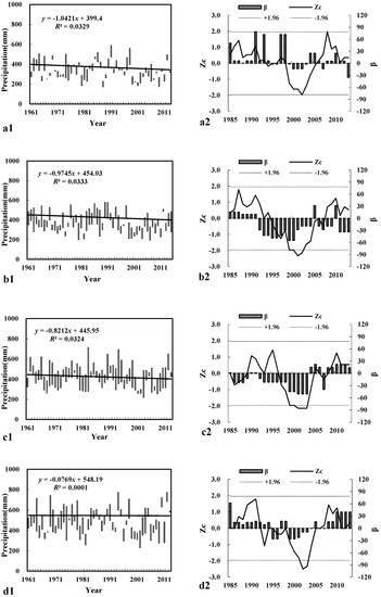 The changing tendency of District III was consistent with that of District I and District II. The precipitation fluctuation’s changes between 1961 and 1990 were not huge. From the year 1991, a significantly downward fluctuating period occurred (Figure 2(c1)). The minimum value occurred in 2007, and the precipitation was 308.6 mm (±19.0). After that, the precipitation gradually increased and reached the peak value in 2012 of 590.1 mm (±86.4). The difference between the maximum precipitation and the minimum precipitation was 281.5 mm. The precipitation sequence changing tendency showed that (Figure 2(c2)) there was a main rising tendency in the time period 2004–2015 (β > 0). Before 2004, the changing tendency was mainly decreasing during 1986–2003 (β < 0), except in the years 1990 and 1991. In these years, the changes from 1999 to 2003 reached a significant level (Zc values were above 95% of the confidence line).