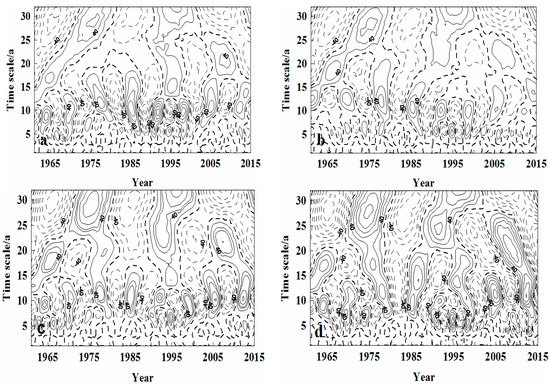 The distribution characteristics of the wavelet coefficient real part reflect the variable changing cyclical scope in the sequence. Morlet complex wavelet exchange was used to analyze Horqin region’s precipitation time sequences, as shown in Figure 3. The solid line means the real part coefficient was positive and the precipitation was high. The spotted line means the real part coefficient was negative and the precipitation was low. The real part coefficient of bold spotted line is 0, meaning anomalies occurred at this spot. As the maximum sequence was 32, this research mainly considered cyclical changes that did not exceed 32 years. In Figure 3a, the precipitation of District I between 1961 and 2015 mainly had the multi-time scale characteristics, which were, respectively, two change cycles of 5–14 years and 23–32 years. In the time scale of 24–32 years, the cyclical fluctuations were very significant, and the annual precipitation experienced two standard cyclical fluctuations from low to high precipitation. The periods of low precipitation were: 1961–1972, 1983–1992 and 2002–2015. The periods with high precipitation were: 1973–1982 and 1993–2001. In the time scale of 5–14 years, there were many cycles, of alternating between high precipitation periods and low precipitation periods, as well as many precipitation change-points. Meanwhile, it can be seen that the cyclical changes of the above two scales were also very stable during the entire analyzed period.
