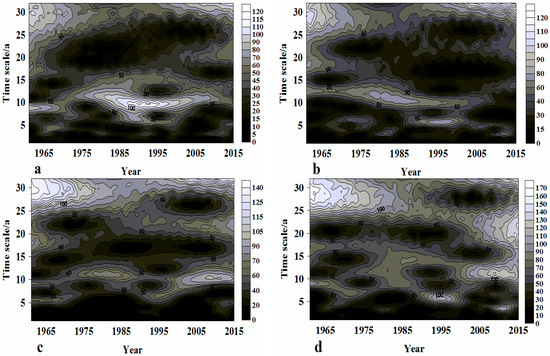 The isoline of Morlet wavelet module of annual precipitation during 1961–2015 ((a–d) represent Districts I, II, III and IV, respectively).