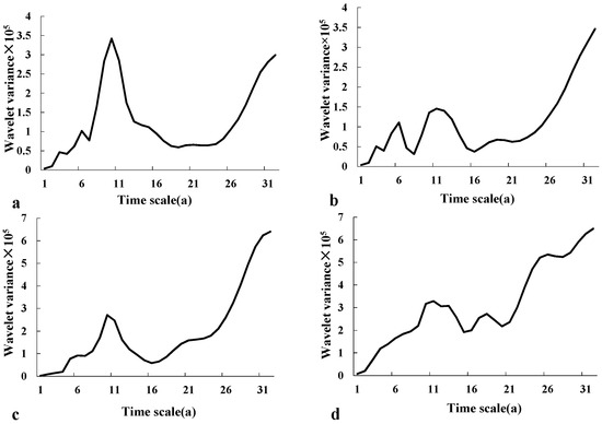 where Var(a) is the wavelet variance [24]. In wavelet analysis, using wavelet variance to confirm the main time scale and the main cycle is widely used [24]. The wavelet variance diagram can accurately reflect the precipitation’s cyclical strength as the time scale changes, which reflects the distribution of the fluctuation energy with the scale changing and the main time scale of the precipitation sequence can be determined by the wavelet variance diagram. The scale corresponding to the peak value is called this sequence’s main time scale, and the cycle is the main cycle of the time sequence change.