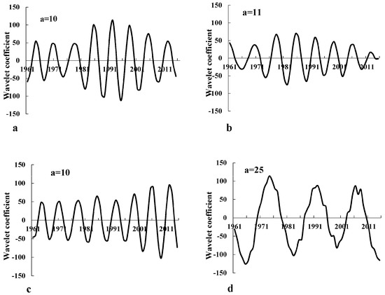 According to the results of the wavelet variance analysis, a peak value of the cycles was found, which was regarded as the first main cycle in this time scale. Then, the wavelet coefficient real part curve of the precipitation in the first main cycle’s time scale of each district was drawn, which showed the times of the main cyclical changes in each District (Figure 6). In Figure 6, the cyclical changes of annul precipitation was about seven years in the characteristic time scale of 10 years in District I. The annual precipitation’s cyclical changes were about seven years, which have mainly experienced eight changes from high precipitation to low precipitation (Figure 6a). In the characteristic time scale of 11 years, District II’s cyclical change of annual precipitation was about eight years and it experienced approximately seven cyclical changes from high precipitation to low precipitation (Figure 6b); in the characteristic time scale of 10 years, District III’s annual precipitation cycle was about seven years and it experienced approximately eight cyclical changes from high precipitation to low precipitation (Figure 6c); in the characteristic time scale of 25 years, District IV’s annual precipitation cyclical change was about 17 years and it experienced approximately three cyclical changes from high precipitation to low precipitation (Figure 6d).