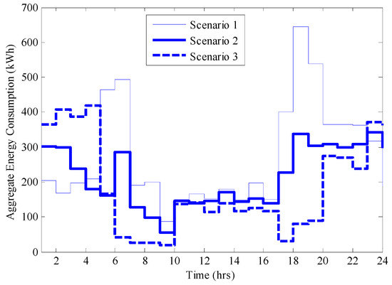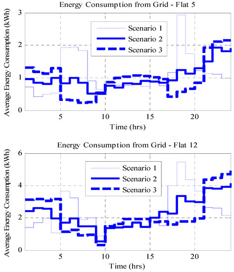 The results of average hourly energy consumption and expenditure from the grid for flats 5 and 12 chosen at random during summer are presented in Figure 2. It can be seen from Figure 2 that Scenarios 2 and 3 outperformed Scenario 1 for both flats because of the optimization scheduling involved in their algorithms. However, Scenario 3 outperformed Scenario 2 for both flats. The household consumed the least energy from the utility grid during morning and evening peak periods under Scenario 3 since the battery was the primary source of energy at peak periods. This, therefore, led to reduced energy consumption from the grid during peak periods and, consequently, reduced energy expenditure and increased financial savings for the consumers. The energy consumed from the battery at peak time by the scheduled appliances is the energy bought from the grid at a non-peak (off-peak and standard periods) TOU (low) prices. Also, the aggregate energy consumption profile for the one hundred households is presented in Figure 3.