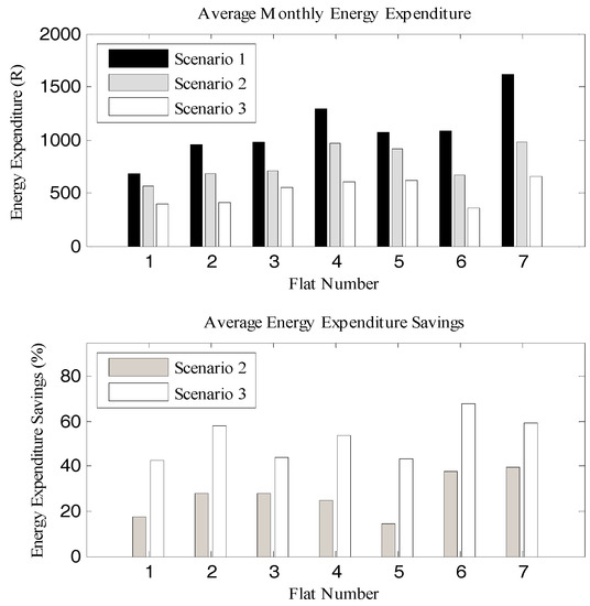 Hence, the Scenario 3 (ESDS) algorithm would offer the consumers more financial savings than the Scenario 2 algorithm. Average monthly energy expenditure in the local currency of South African rands (R) for seven out of the twenty consumers chosen at random is presented in Figure 4. Therefore, the consumers under Scenarios 2 and 3 algorithms were able to reduce their average energy expenditure, compared to Scenario 1. However, the financial savings on energy expenditure was higher for the consumers in Scenario 3 than for those in Scenario 2 due to the possession of DES in the consumers’ premises. The average monthly financial savings for all the households in Scenarios 2 and 3 were 27% and 53%, respectively. The battery payback periods are directly related to the amount of energy consumption and expenditure savings. The payback period on battery investment differ from one consumer to another within Scenario 3, and this depends on how much energy is scheduled for battery supply in the household.
