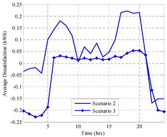 Energy consumption scheduling on consumers’ premises has known advantages, but not without the disadvantage of demand dissatisfaction. However, the implementation of DES in an ESDS algorithm proposes reduced or negligible demand dissatisfaction cost. In terms of the dissatisfaction cost, it was observed that Scenario 3 offered lower dissatisfaction to consumers than Scenario 2 especially at peak periods. This is because the consumers under Scenario 3 had purchased energy from the grid at non-peak times (low energy price periods) and stored it in their batteries. This stored energy is primarily discharged locally to household appliances during morning and evening peak periods, and thereby mitigates the peak period demand dissatisfaction that characterizes the Scenario 2 scheduling algorithm like other DSM energy scheduling algorithms in the literature [4,5,7]. The effect of DSM scheduling in Scenarios 2 and 3 on dissatisfaction cost is shown in Figure 5. Dissatisfaction cost was not considered for Scenario 1 because it was the consumer’s traditional nominal consumption without energy scheduling and, hence, has no demand dissatisfaction cost.