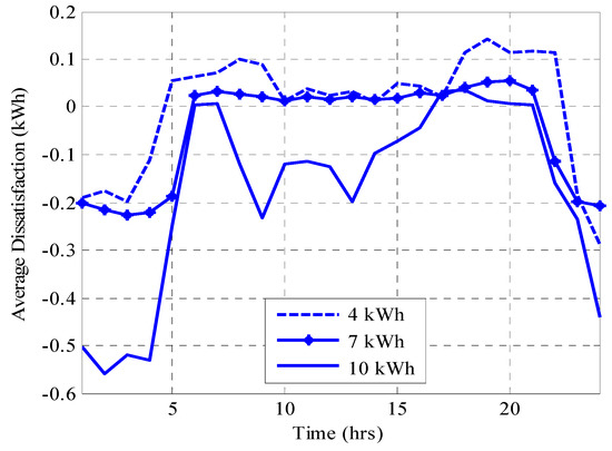 Also, further sensitivity analysis was carried out to investigate the effect of battery capacity on consumer’s dissatisfaction. It was discovered that the higher the battery capacity acquired by a consumer, the less it will be dissatisfied by appliance scheduling with respect to its average peak period demand. However, battery capacity cannot indefinitely increase; otherwise, the law of diminishing returns would set in for financial savings and battery pay-back period. The battery capacity assumed initially in the simulation was 7 kWh. Therefore, the effects of 4 kWh and 10 kWh battery capacities on demand dissatisfaction were studied, and the results found are presented in Figure 6. The average daily demand dissatisfaction obtained were 0.063 kWh, −1.265 kWh, and −4.217 kWh for the 4 kWh, 7 kWh, and 10 kWh batteries, respectively. This implies that the 10 kWh battery capacities would not be economical for the consumers whose consumption data was simulated in this work due to very high satisfaction. However, the consumer can choose between the 4 kWh and 7 kWh batteries depending on their tolerance for dissatisfaction. From interpolation, it was observed that zero dissatisfaction can be achieved with approximately 5 kWh battery capacity. Too high satisfaction is not cost efficient because optimal satisfaction, expenditure savings, and good battery health intercept at zero dissatisfaction.