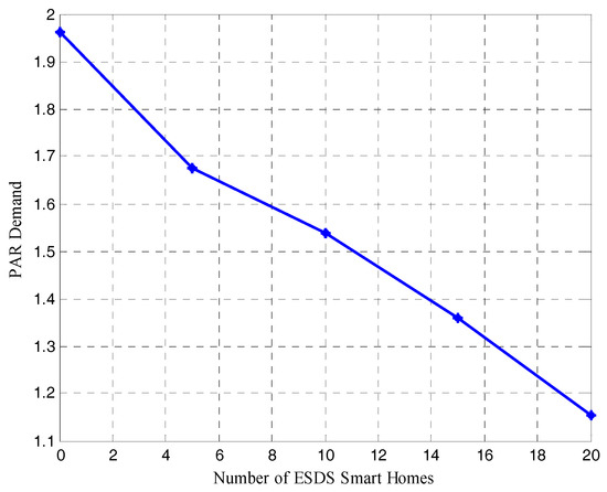 The relationship between number of ESDS smart homes in the smart grid and PAR demand was also investigated and the result is presented in Figure 7. This sensitivity analysis was carried out on PAR demand because it may not be a realistic assumption that all the smart homes in a smart microgrid or smart grid at large would have battery storage facilities installed in their premises for DSM purposes. And as can be seen from Figure 7, the higher the number of ESDS smart homes in a smart grid, the lower the PAR demand of the smart grid.