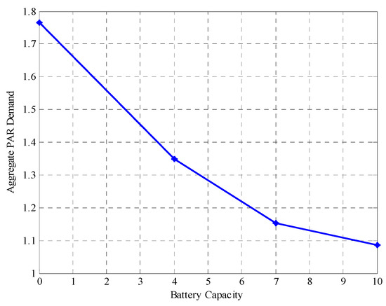 The relationship between battery capacity and aggregate PAR demand is presented in Figure 8, and it shows that the higher the battery capacity of the in-Home Energy Storage (iHES) device, the lower the aggregate PAR demand from the grid. This was simulated for no battery (i.e., 0 kWh), 4 kWh, 7 kWh, and 10 kWh battery capacities.
