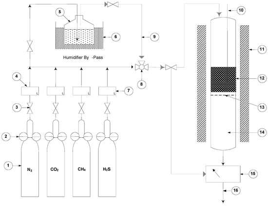 Schematic diagram of adsorption test rig. (1) Gas cylinders; (2) Pressure regulators; (3) Pinch valve; (4) Mass flow meter; (5) Humidifier; (6) Water bath; (7) Mass flow controller; (8) Three-way controller; (9) Insulated pipeline; (10) Thermocouple; (11) Furnace; (12) Biochar; (13) Glass wool; (14) Reactor; (15) Flue gas analyzer; (16) Vent.