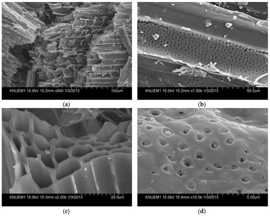 The physicochemical characteristics of the four different biochars used in this study are shown in Table 1. All biochars were alkaline (pH 9.9–11.3) with a typical pH range of common biochars produced at high temperatures [15,16]. The Brunauer–Emmett–Teller (BET) surface areas of the Japanese oak and perilla biochars showed a similarity (~470 m2/g) and the lowest BET surface area of 270.8 m2/g was observed for Korean oak biochar derived from pyrolysis at a relatively low temperature compared to the Japanese oak and perilla biochars. The average pore diameters of all biochars were less than 2 nm, assumed in a range of micropores. The scanning electron micrographs (SEM) images of perilla biochar show the presence of micropores (Figure 2). These images are similar to those in a study of Ahmad et al., which showed the SEM images of soybean stover biochar produced from the same condition of pyrolysis [9]. The Japanese and Korean oak biochars had less ash contents (3.3% and 5.1%, respectively) than the soybean stover and perilla biochars (17.2% and 41.9%, respectively). The relatively high ash contents in the soybean stover and perilla biochars may be due to leafy feedstock. The carbon contents of the Japanese and Korean oak biochars showed higher values than those of the soybean stover and perilla biochars.