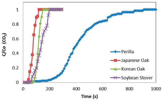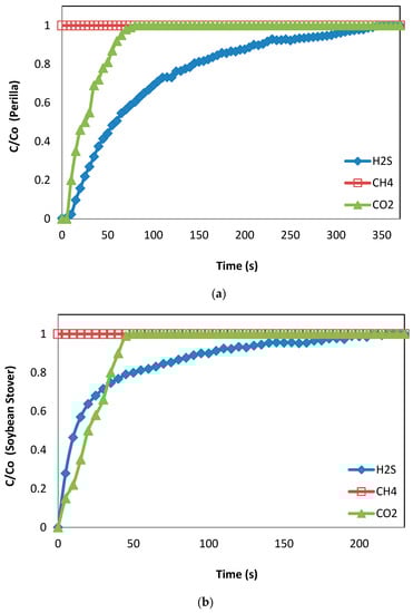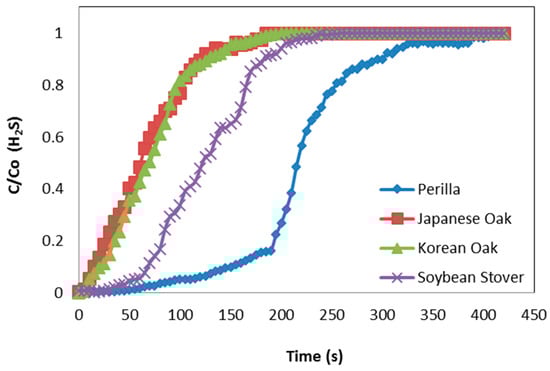 The breakthrough times of H2S and CO2 indicated that they were adsorbed. The breakthrough times for the Japanese and Korean oak biochars were shorter and steeper than those of the perilla and soybean stover biochars. This means that Japanese and Korean oak biochars adsorb H2S and CO2; however, the sorption capacities can be poor compared to perilla and soybean stover biochars. Perilla and soybean stover biochars showed longer breakthrough times, indicating better retention of H2S and CO2 adsorbate (Figure 3). Shang et al. [18] stated that the H2S breakthrough capacity is also governed by the local pH within the pore system.