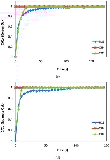 Breakthrough curves of simultaneous removal of H2S, CH4, and CO2 on different biochars: (a) perilla; (b) soybean stover; (c) Korean oak; and (d) Japanese oak.