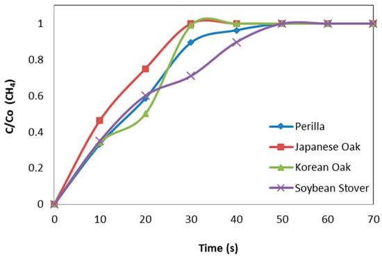 It is noticed that the adsorption of H2S was more complete than that of CO2 (Figure 3). A recent study using sugarcane bagasse biochar showed that it is a promising CO2-adsorbing material with capacity of about 70 mg/g [14]. However, the current study shows a much lower capacity (16 mg/g). The decrease in the adsorption capacity could be due to competition for the sorption sites between CO2 and H2S and the starting material used to produce the biochars. This study measurement was taken during simultaneous exposure to both CO2 and H2S, whereas the report by Creamer et al. [14] was conducted using only CO2. In order to prove the competition, a single-gas adsorption study for CO2, CH4, and H2S was performed. Figure 4, Figure 5 and Figure 6 show the breakthrough curves for the single-gas study. Figure 4 proves that without the presence of CH4 and CO2, all four biochars showed a longer H2S adsorption breakthrough time compared to the simultaneous study. A similar trend was seen for the other gases as well, in Figure 5 and Figure 6, without the presence of other gases. A single-gas adsorption (CO2) by the perilla yield achieved about a 294 mg/g adsorption capacity compared to only 70 mg/g by Creamer et al. [14]. A comparable work using activated carbon also reported that the presence of CO2 inhibited H2S adsorption due to the competitive adsorption and reaction between CO2 and H2S on the surface of the activated carbon [20]. The saturation time for H2S and CO2 in the single runs was longer than in the simultaneous run. In terms of the preference of adsorption, all biochars showed a longer breakthrough time for H2S than for CO2. This is because the adsorption of CO2 was mainly through physisorption, whereas for H2S, the adsorption may be governed by both physisorption and the local pH within the pores. For CH4 gas (Figure 6) it was observed that the breakthrough time was very short (less than 70 s). This shows that the biochars could hardly adsorb CH4, even without any competition with other gases, and manifested in the simultaneous adsorption with CO2 and H2S. Arami-Niya et al. [21] stated that only narrow, microporous-sized particles can adsorb methane.