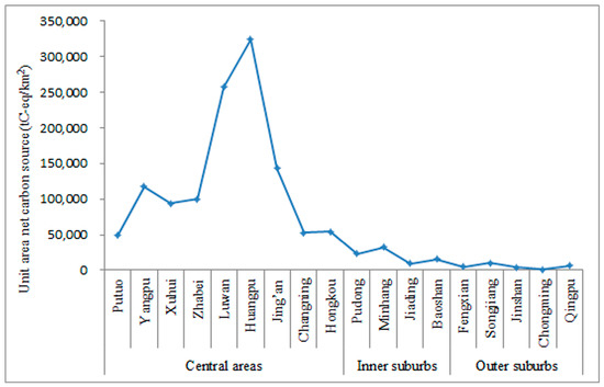 Per capita carbon emissions produced by the registered population in central urban areas are generally lower than those in the suburbs, but the net carbon source per unit area in the central urban areas is generally higher than in the suburbs. Moreover, the core area emissions are much higher overall than the periphery of the central urban areas, the periphery of the central urban areas is higher than that of the inner suburbs, and those for the inner suburbs are higher than those for the outer suburbs. These results reveal a diminishing trend gradient. Additionally, the distribution of net carbon source per unit GDP is more complicated and lacks clear spatial laws. Therefore, the conclusion that skyscrapers are more environmentally friendly than the countryside is biased, only reflecting the per capita carbon emission.
