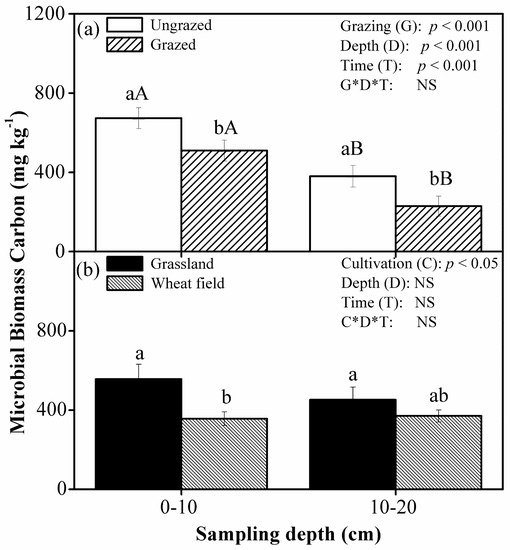 Mean (±SE, n = 3) soil microbial biomass (mg·kg−1), as affected by grazing (a) and cultivation (b), at 0–10 and 10–20 cm depths in 2010 in Inner Mongolia, China. Grazing (G): grazing treatment; Cultivation (C): cultivation treatment; Depth (D): sampling depth; Time (T): sampling time; NS: not significant. Under ‘grazing’ or ‘cultivation’, different lowercase letters in the same soil depth designate significant differences between treatments, and different uppercase letters in the same treatment designate significant differences between soil depths at the level of p < 0.05.