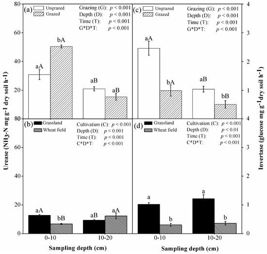 Mean (±SE, n = 3) activities of soil urease (NH3-N mg·g−1 dry soil·h−1) and invertase (glucose mg·g−1 dry soil·h−1), as affected by grazing (a,c) and cultivation (b,d), at 0–10 and 10–20 cm depths in 2010 in Inner Mongolia, China. Grazing (G): grazing treatment; Cultivation (C): cultivation treatment; Depth (D): sampling depth; Time (T): sampling time. Under ‘grazing’ or ‘cultivation’, different lowercase letters in the same soil depth designate significant differences between treatments, and different uppercase letters in the same treatment designate significant differences between soil depths at the level of p < 0.05.