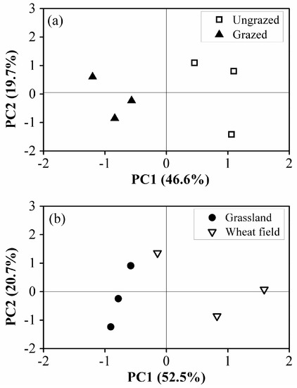 Principal coordinate analysis of soil microbial communities’ carbon source utilization patterns after 30 years of grazing (a) and 38 years of cultivation (b).
