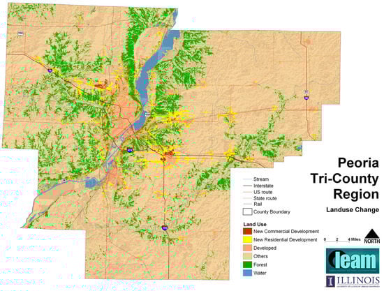 In the early 2000s, the three counties surrounding Peoria, Illinois (Woodford, Tazwell, and Peoria) were witnessing significant conversion of very fertile and productive agricultural land to residential and commercial land-use. There was a distinct sense of unease about this trend, although there was no specific analytical proof for its existence. Woodford County in particular, was concerned about its agricultural heritage. The county outlined several strategies for preserving agricultural land. One particular strategy required a change in the county zoning ordinance that would require 40-acre minimum lot size on current agricultural lands. At roughly the same time in a regional planning exercise, a number of simulations of future land-use change were being run for the tri-county region and reviewed and critiqued in public workshops [31]. These simulations established the extent and spatial distribution of future growth in a business-as-usual scenario described through maps and depictions of the impacts of this growth. Other scenarios explored included higher and lower growth rates and various public investments and policy ideas, including the proposed ordinance change in Woodford County. Figure 1 shows expected land-use outcomes in a ‘business-as-usual’ scenario. After our simulation, we used the land cover data provided by the county’s planning board to assess loss of agricultural and ecological lands associated with future growth using 30-by-30-m resolution.
