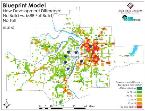 PSSs can assist planners in convening local stakeholders to discuss and validate environmental assessment results and in the process arouse a regional consciousness of the potential spatial and temporal spillover of environmental impacts. Geertman [41] points out that PSS tools can enhance participatory planning processes, because “a greater degree of access to relevant information will lead to the consideration of a greater number of alternative scenarios—which in turn will result in a better informed public debate”. One project that exemplifies this idea is the application of LEAM to the two-state, eight-county region around St. Louis, Missouri (MO) [32,42]. In this project, we coupled various other models with LEAM to analyze the potential impacts of the land-use change results. Two in particular were a four step transportation model (that utilized over 2200 Transportation Analysis Zones, TAZ) to calculate travel time changes for each scenario, and a regional economic input-output model (conducted on a household level) that provided demand for space and assessed economic implications.