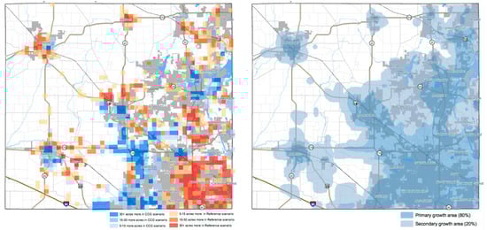 The McHenry County Planning board convened more than 10 public meetings made up of a range of public interests, stakeholder groups, government employees and officials, and planners. The process revealed an early, major concern with the projected population forecast for 2030 that was derived using LEAMecon. This was the bellwether issue that underlay a larger conflict on the future of the County between pro and anti-growth advocates; one group of residents hoping to continue the past development trends and environmental groups urging protection of environmentally sensitive and agricultural lands. After lengthy discussions LEAM simulated a range of potential scenarios identified by the County Planning Board (18 prime scenarios) of future land-use patterns. The RPC identified various preferred outcome scenarios [26,45]. One such scenario, the Compact Contiguous Growth (CCG) composite scenario is shown in Figure 3. The difference between the reference scenario and the CCG composite scenario is on the left. Areas in blue receive more development in the CCG composite scenario; areas in red receive more development in the Reference scenario. A notable difference is seen in the southwest portion of the County. This is due to a limit that the CCG composite scenario places on the amount of vacant land available in that part of the county. The right shows an urban growth boundary that was also considered as part of the scenario analysis.