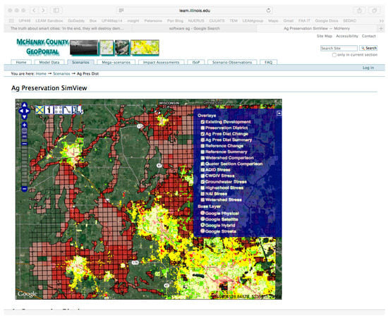 The spatially and temporally explicit information generated by the LEAM PSS helped the McHenry County Regional Plan Commission (RPC) objectively assess the impacts of their proposed policies. For example, one scenario identified spatial locations where farmland and ecologically sensitive areas were identified as at risk [47]. With LEAM information, the RPC could specify where to set up ecological/agriculture preservation districts to prevent a disruption of the critical areas.