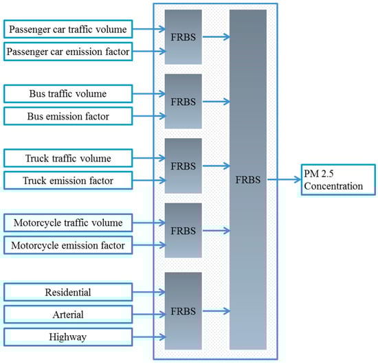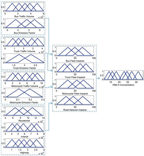 Using the suggested system in Section 3.1, a hierarchical fuzzy inference system is proposed here to estimate the traffic-related suspended particles concentration (PM2.5). This system is developed applying AERMOD dispersion model receptors as the dependent variable, and the transportation parameters including traffic volume, emission factor, and road network as independent variables (Figure 3).
