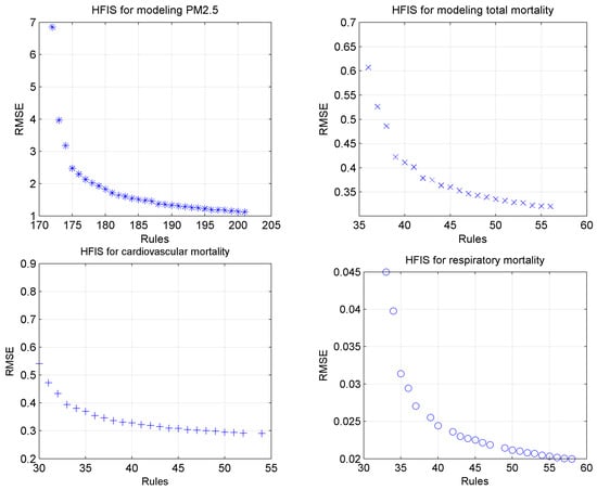 The Pareto fronts produced by a single run of this proposed algorithm for each model is shown in Figure 6. This algorithm covers the Pareto fronts in all four models in an appropriate manner. The number of rule’s range and accuracy (RMSE) differ with respect to the studied issue in this article. As observed in Figure 6, the numbers of rule’s range are not significantly different in the three models estimating health outcomes. In general, the more the number of input parameter, the more the rules produced to describe the system.