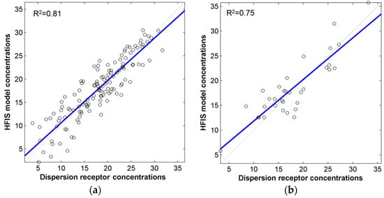 PM2.5 concentration diagram resulted from dispersion model versus hierarchical fuzzy inference system: (a) for training datasets; and (b) for validation datasets.