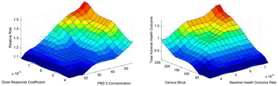 The control surface plots for census block versus baseline health outcome rate, PM2.5 concentration versus concentration response coefficient, and total adverse health outcome versus relative risk are shown in Figure 12. These plots are derived from the generated rules of the respective FISs, which they depict the dependency of the outputs as a function of the inputs. Moreover, these plots indicate the consistency of the rules in HFISTM model.