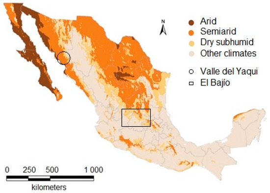 Drylands are defined by their scarcity of water. They are zones where precipitation is counterbalanced by evaporation from surfaces and transpiration by plants (evapotranspiration) [17]. The United Nations Convention to Combat Desertification (UNCTAD) ranks drylands according to an aridity index into three categories: arid, semi-arid and dry subhumid [18]. Using these criteria, the estimated drylands in Mexico are approximately 101.5 million hectares or just over half the total territory (see Figure 1). Of this area, arid lands account for 15.7%, semi-arid lands 58% and dry subhumid lands 26.3% [19]. In Mexico, 77% of the available water is used for agriculture; water availability in most of the central and northern regions of the country is already scarce [20]. Paradoxically, in the regions of the country classified as water stressed, the economy has developed more extensively than the rest of the country [20]. This is because of the proximity to the United States markets; consequently, the population in these areas has also grown faster, further increasing the water demand [21]. Mexico is now considered as a water-scarce country, facing several technical and administrative challenges. For example, there is a need to optimize water use, particularly in agricultural areas such as the “El Bajío” (located in the middle central portion of the country) and “Valle del Yaqui” (located in the northwestern portion of the country). In these two areas, the competition for water between municipal and industrial demand is increasing with population growth and urbanization [22].