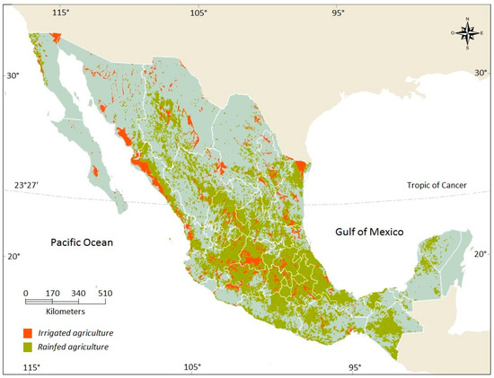 Land area of Mexico covered with irrigated and rainfed agriculture [26].