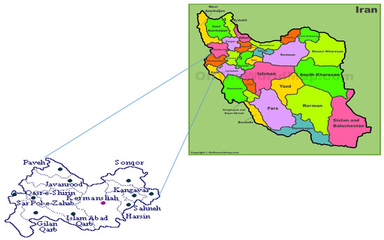 Figure 1 shows the study area, comprised of the Kermanshah township, which has a total area of 5658.4 m2 and is located in the western part of Iran. It is subdivided into thirteen counties including Sanjabi, Razavar, Jalalvand, Baladarband, Miandarband, Alayarkhani, Mahidasht, Faraman, Firoozabad, Osmanvand, Haftashyan, Gharesoo, and Jaghanarges. The Kermanshah township is located between latitudes 33°37′N and 35°17′N and longitudes 45°20′E and 48°1′E. The yearly average precipitation of the Kermanshah township is about 456.8 mm, the mean annual temperature is 14 °C, and the average relative humidity is over 40% [1]. Agriculture is the primary source of livelihood and contributes significantly to the food production in Kermanshah Province. The population of the Kermanshah township was 851,405 in 2016, with 20.6% involved in agricultural production. The main crops grown in the township are wheat, barley, canola, corn, and sugerbeets [1].