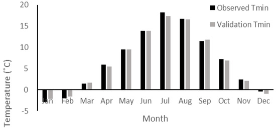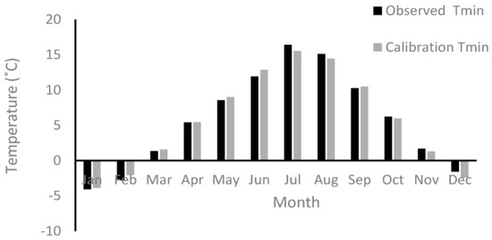 The least difference between observed data and simulation data in minimum temperature during calibration and validation shows that the parameter was precisely modeled during most of the year. During the calibration period, the most significant difference between observed data and simulated data occurred during June, when the simulated data had 0.96 °C more than observed data. From the visual inspection, the downscaled data series resembles the observed series. Moreover, during the validation period, the simulation data in July decreased by 0.85 °C compared to observed data (Table 4).