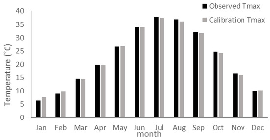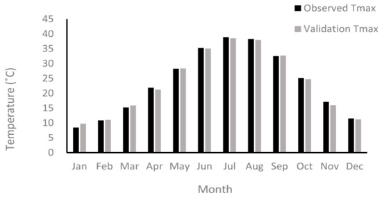 Figure 4 and Figure 5 indicate calibration and validation graphs of maximum temperature at the Kermanshah synoptic station. Interestingly, the observed and simulated data had acceptable compliance. Therefore, it can be concluded that our model has predictive power. Moreover, the least difference between observed data and simulation data during calibration and validation shows that the parameter was precisely modeled for most of the year. During the calibration period, the most significant difference between observed data and simulated data occurred during January, when the simulated data was 1.19 °C higher than the observed data. Based on statistical and graphical results, it is clear that the downscaled data series is almost close to the observed series. Moreover, during the validation period, the simulation data in January increased by 1.33 °C, compared to the observed data (Table 5).