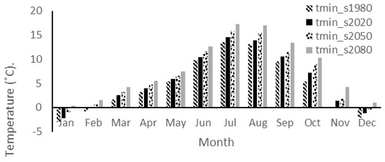 HadCM3, under the A2 scenario, has been used for investigating climate change in this study. Accordingly, precipitation and minimum and maximum daily temperature parameters were calculated in the 2010–2099 time period. Figure 8 shows the differences between the observed (1961–1990) and predicted (2010–2099) time periods in the monthly minimum temperature under A2 scenarios. According to Table 7, during the 2020 period, the largest difference between observed and simulated data occurred during October, when the simulated data was 1.87 °C higher than the observed data. The monthly average of minimum temperature increased, compared to the baseline for the 2020 series, by 0.98 °C. Also, during the 2050 time series, the largest difference between the observed data and the simulated data occurred during October, when the simulated data showed 3.64 °C high than the observed data. Moreover, the monthly average temperatures increased by 1.99 °C, compared to baseline for the 2050 series. In addition, Table 7 shows that the largest difference between the observed and simulated data occurred during October, when the simulated data was 4.97 °C higher than observed data, and that the monthly average minimum temperature would increase by 3.3 °C, compared to the baseline for 2080 series.