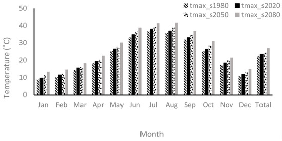 Table 8, compares observed and simulated monthly maximum temperatures under A2 scenarios. The results show that the largest difference between observed and simulated data during the 2020 period happened during June, when the simulated data was 1.67 °C higher than the observed data. Overall, the monthly average maximum temperature difference of 1.25 °C would increase compared to the baseline for the 2020 period. On the other hand, the largest difference between the observed and simulated calculations during the 2050 period occurred during June, when the simulated data was 3.44 °C higher than the observed data, and the monthly average temperature difference of 2.58 °C tended to increase compared to the baseline. During the 2080 period, the monthly average maximum temperatures increased by 4.8 °C compared to the baseline, and the largest difference between the observed and simulated data happened during June, when the simulated data was 6.15 °C higher than the observed data. Figure 9 illustrates the prediction of the monthly maximum temperature under the A2 scenario during different time periods at the Kermanshah synoptic station