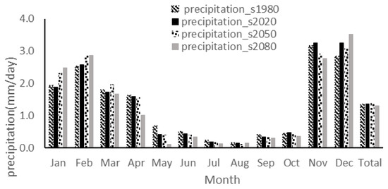 Differences in the monthly predicted (2010–2099) and observed (1961–1990) precipitation under A2 scenarios are shown in Table 9. According to this table, the monthly average precipitation decreased compared to the baseline in most of the months for the 2020 series. Interestingly, the largest difference between the observed data and the simulated data for the 2020 period, happened during February, October, November, and December, when the simulated data were 0.05, 0.02, 0.09, and 0.4 mm, respectively, higher than the observed data. Also, the largest difference between the observed and simulated data occurred during January, February, March, and December, in which simulated data had 0.38, 0.36, 0.17, and 0.25 mm, respectively, more than the observed data during the 2050 series, and the monthly average precipitation decreased compared to the baseline during this eight month period. Also, during the 2080 series, the monthly average precipitation decreased compared to the baseline for most of the year. However, the largest difference between the observed data and the simulated data occurred during January, February, and December, in which simulated data was higher by 0.55, 0.34 and 0.67 mm, respectively, than the observed data. Figure 10 illustrates the prediction of the monthly precipitation under the A2 scenario during different time periods at the Kermanshah synoptic station.