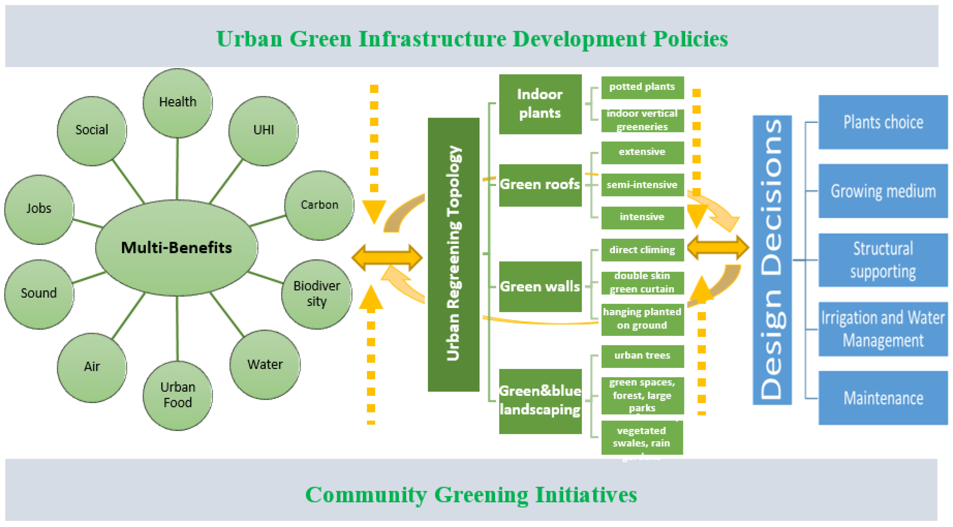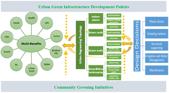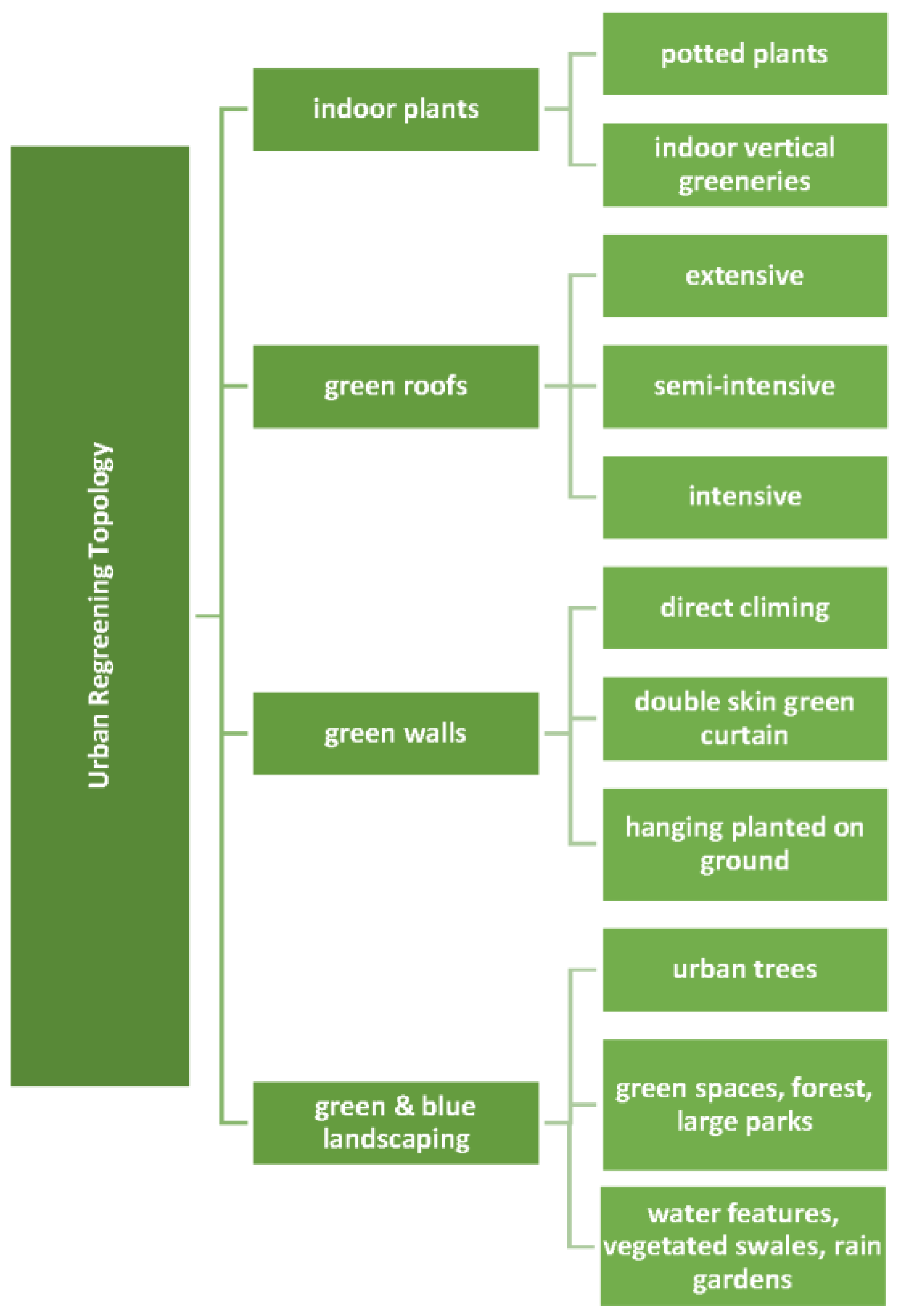 Sustainable urban greening is still in its infancy. A number of online databases are being developed for particular types of actions, such as green roof and wall directories [108,109]. However, indoor greening actions are often overlooked in research and practice. In addition, schemes to assess the multiple benefits of green actions need to be established with the aim of providing support at the very early planning stage. A topology of urban greening actions is illustrated in Figure 3 to provide a starting point to assist in the planning and design of urban green actions. Nevertheless, a topology needs to be further developed to provide generic pathways for community members, planners, designers and other key stakeholders to mainstream nature based solutions in their urban planning and design.