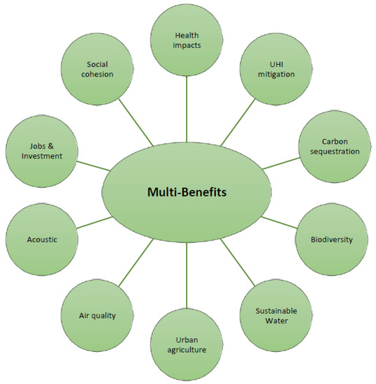 Urban green infrastructure can offer multiple benefits simultaneously. Although the existing evidence is fragmented, studies are revealing dynamic ecosystem services benefits. To optimise and realise the potentials of urban greening actions, it is important to consider sustainability features over the whole life cycle of the project. To date the evidence base for the multiple benefits of urban green infrastructure is complicated and limited. Based on previous research in sustainability impact assessment [29,30,31], and a review of the urban green infrastructure literature (Table 1), ten categories of potential benefits have been identified (Figure 2).