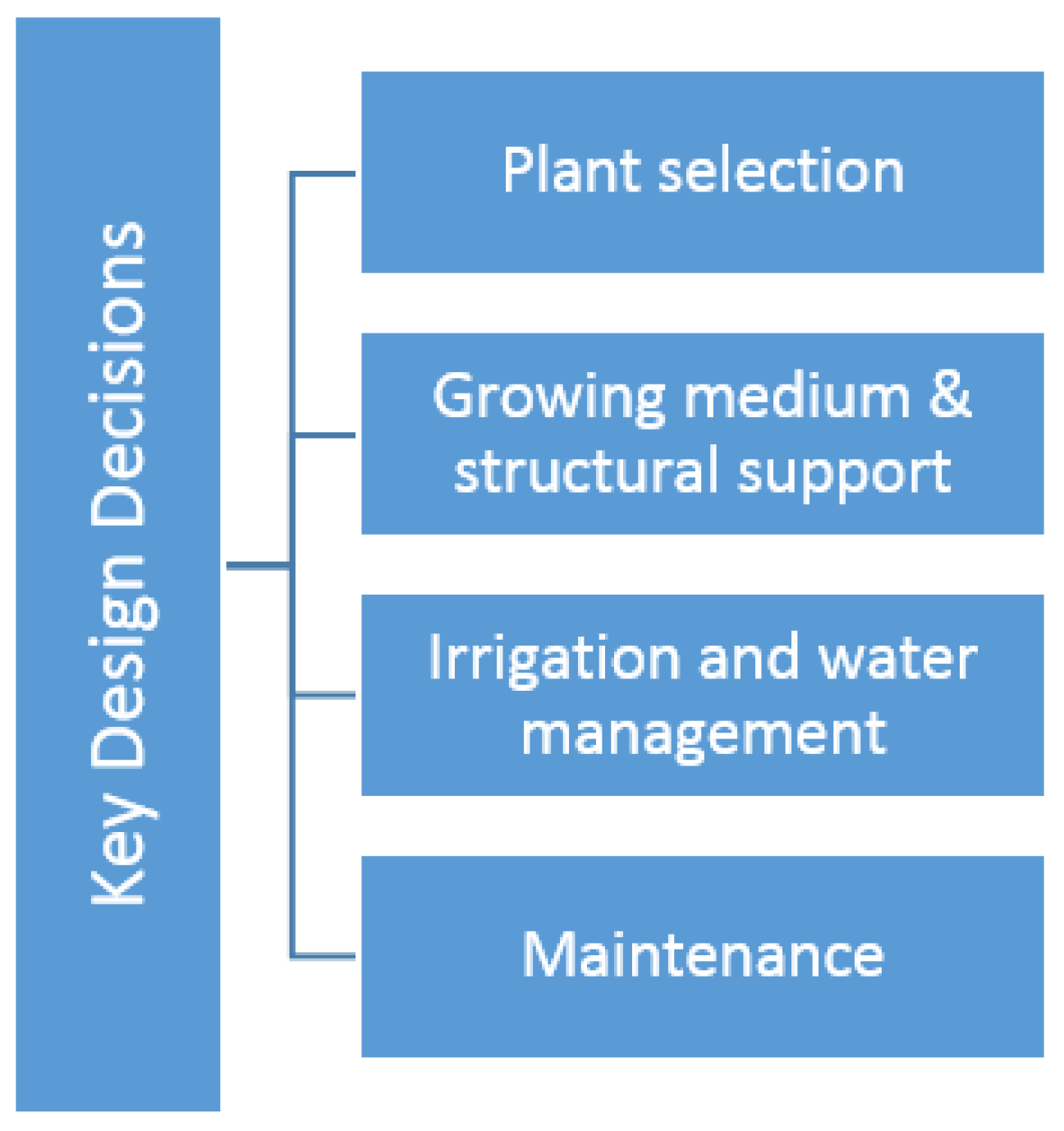 To make urban greening design decisions is a complicated undertaking. It has been argued that knowledge about the ecosystem should be clearly communicated and made easily accessible to policy makers, the general public and other stakeholders [110]. Design options are key in determining policy framework, assessing multiple benefits and engaging with community members [111]. In this paper, the key green design decisions (plants, substrate/supporting elements, irrigation and maintenance) are discussed and illustrated in Figure 4.